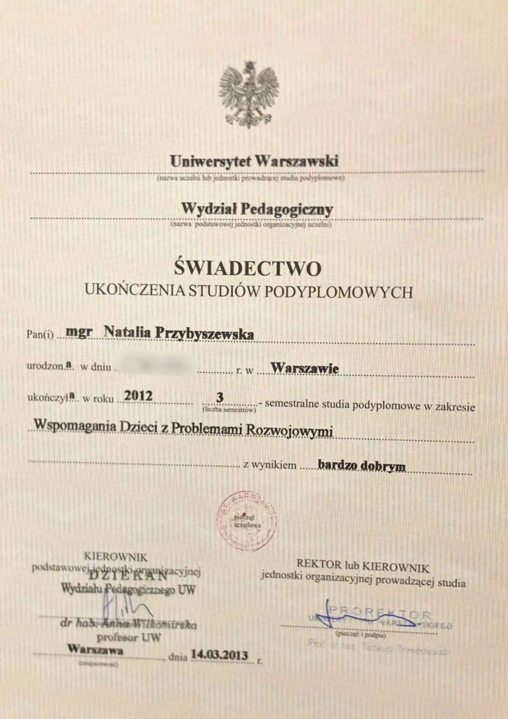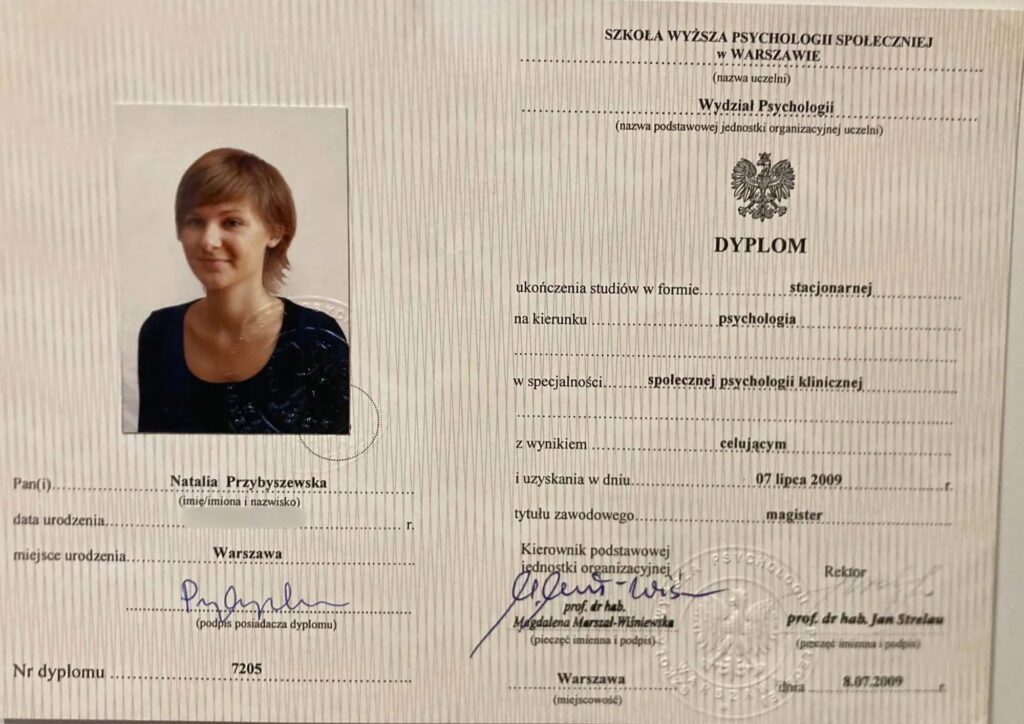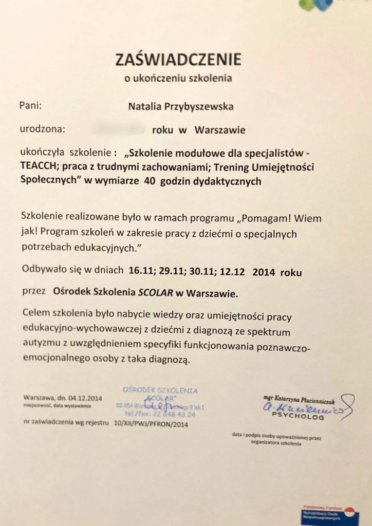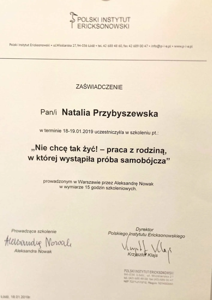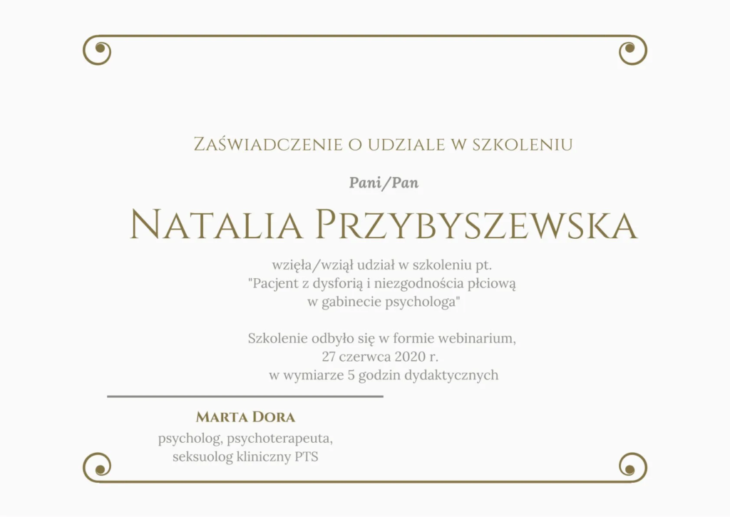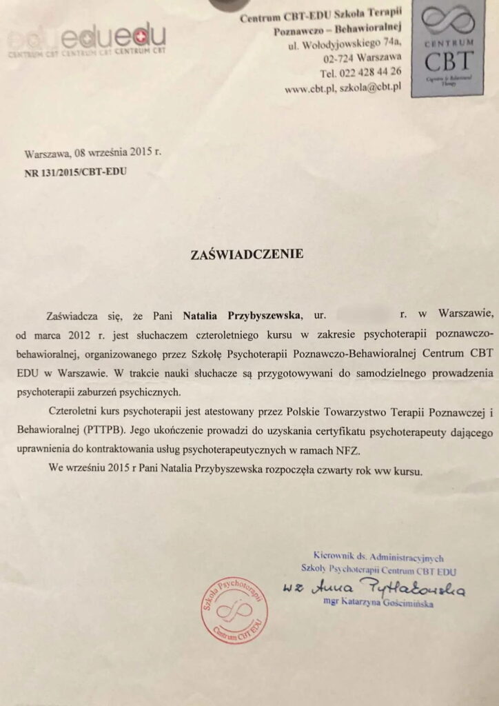 Czteroletnie szkolenie w nurcie poznawczo-behawioralnym w Centrum CBT w Warszawie (w trakcie certyfikacji).