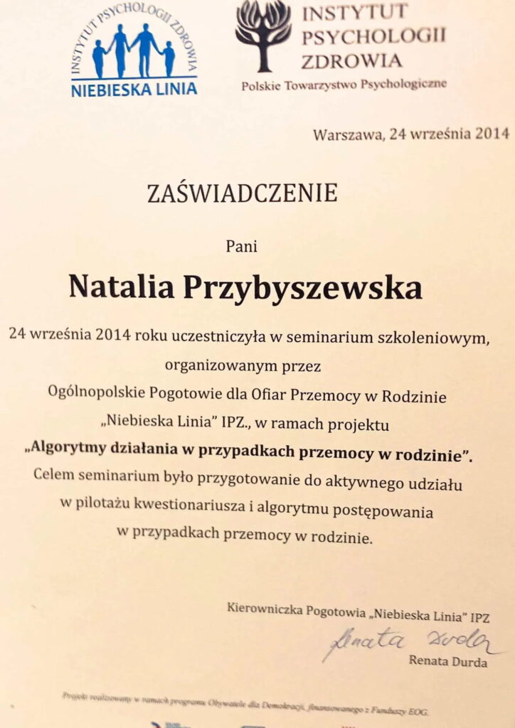 Doświadczenie zdobyłam pracując w Pogotowiu dla Ofiar Przemocy „Niebieska Linia” oraz we współpracy z Fundacją Dajemy Dzieciom Siłę.