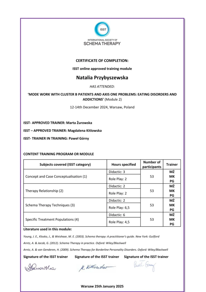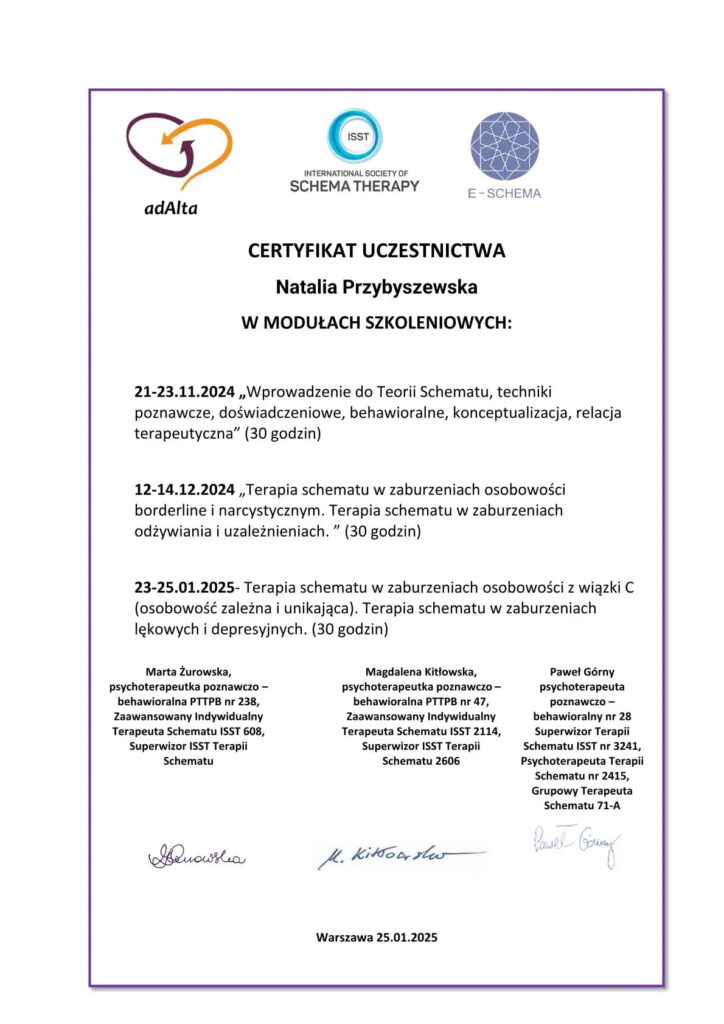 Szkolenie z Terapii Schematu przygotowujące do uzyskania certyfikatu ISST.